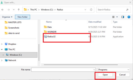 Now look for the Radius 32 icon and click on it once to highlight it and the click OPEN